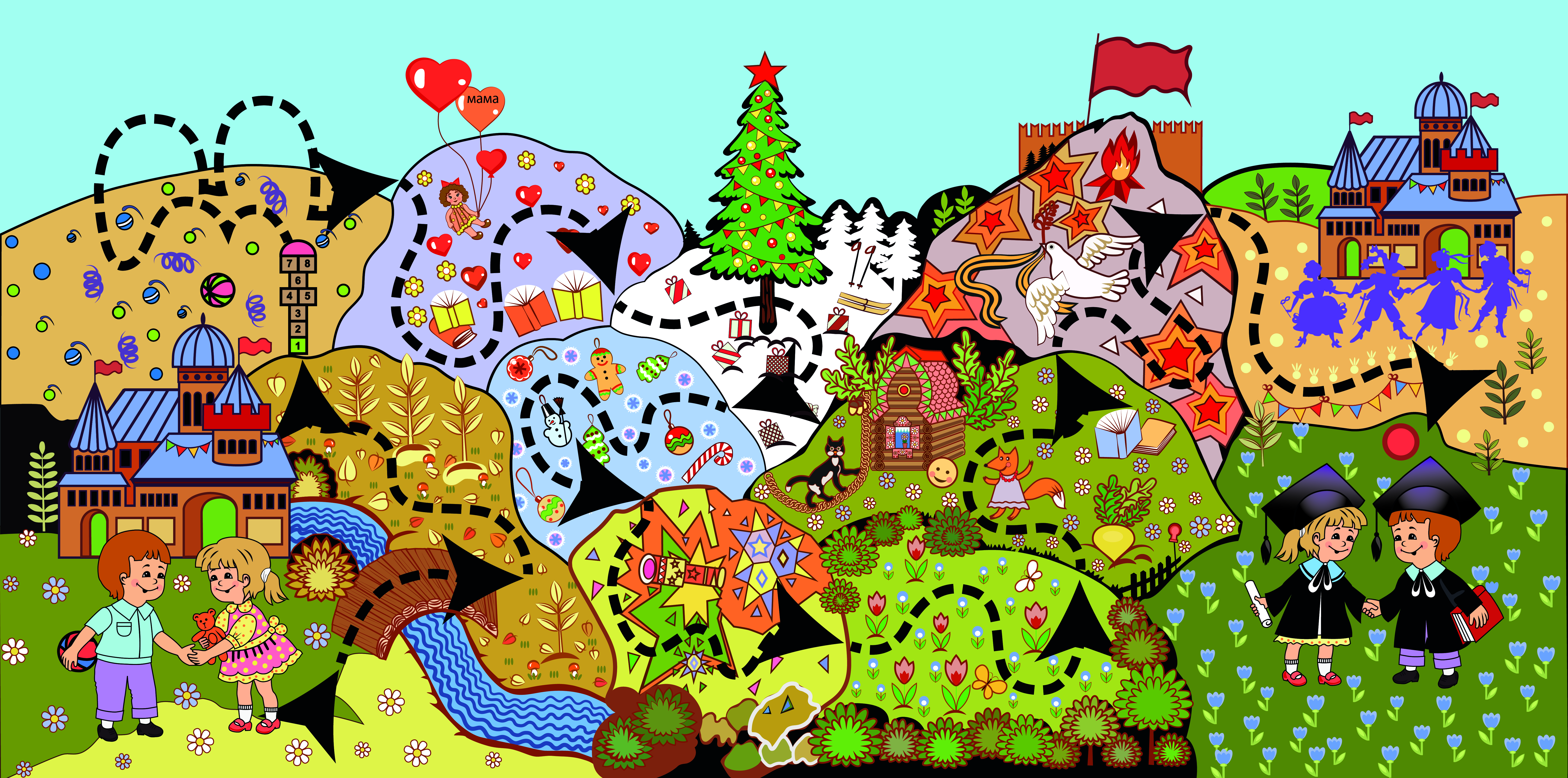 Многие дети, да и взрослые хорошо знакомы с настольными играми-бродилками. Бросаешь кубик и вперед, пока не дойдешь до финиша. От старта до финиша игрокам предстоит преодолеть различные препятствия, сделать остановки, выполнить задания. Именно этот принцип положен в разработанную нами игру-путешествие. Каждая остановка на игровом маршруте помогает открывать Академикам секреты волшебных сил, чтобы стать добрыми волшебниками.